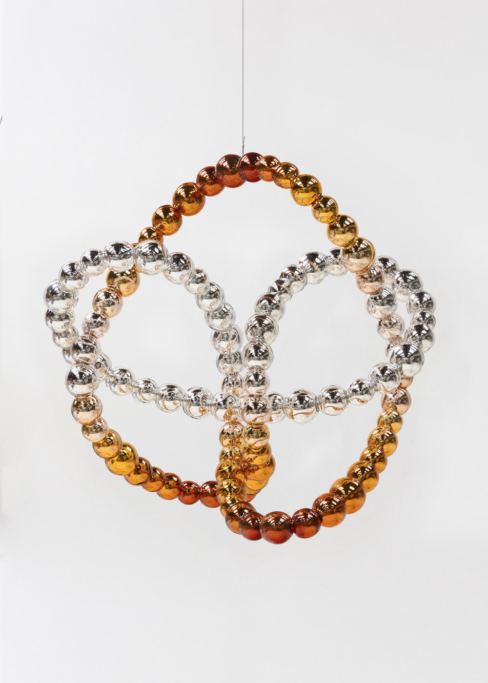 JMO: moving on to another part of the exhibition, one can find more than twenty knot-shaped sculptures hanging like creatures in a dark cave. these knots are made of mirrored and colored glass beads that cast reflections onto each other; they also reflect the knotted structures in their entirety. mathematician aubin arroyo had worked for more than fifteen years on analyzing similar forms through virtual means; thanks to clever mathematical calculations, he deciphered and pushed for all the possibilities of reflection and calculations. in my case, the shape of the knot was inspired by pure research focused on the development of cosmic thought. it just so happened that his mathematical 3D images were similar to my sculptures. we were both naturally surprised by the similarity and decided to meet to see how two worlds, that of art and that of mathematics, could dialogue together. from that point on, conferences, works and exhibitions were created.