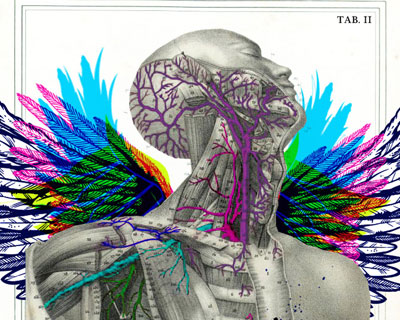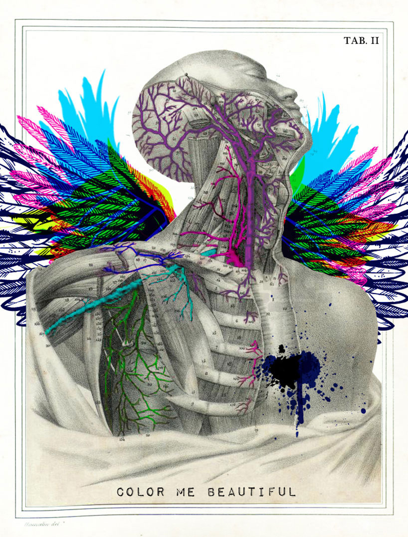 french digital artist isabelle dalle has realized a series of digital anatomical portraits. her imagery is influenced by the traditional art of medical journals, referencing number notations for specific body parts, and detailed muscular and skeletal shading. she juxtaposes these visuals with colorful, contemporary collaged drawings of animals, wings, and deep sea creatures protruding from the features of the face and body. her work displays a jarring perspective of the human form, through the montage of classic and current illustrations.