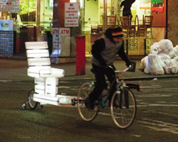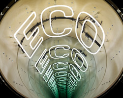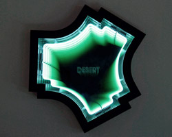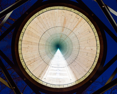 madison square park conservancy’s ‘mad. sq. art‘ presents a site-specific exhibition by brooklyn-based chilean artist iván navarro, situated within the garden of one of new york city’s most iconic landscapes. positioned in front the towering flatiron building, the luminous sculptures merge a staple of the skyline with the street-level scenery. ‘this land is your land’ comprises three wooden water tanks, stilted eight feet about the surface of the ground and elevated to a height just above visitors’ heads. in their interior, navarro has worked with his trademark medium — neon; looking inside one of the towers, visitors can read the words ‘me’ and ‘we’, another features the word ‘bed’, and a third displays the image of a ladder — all of which are composed of a brilliant neon light. an internal arrangement of mirrored panels infinitely reflects each word or image, repeating it perpetually through a seemingly endless vertical space. the exhibition is on view daily until april 13th, 2014.