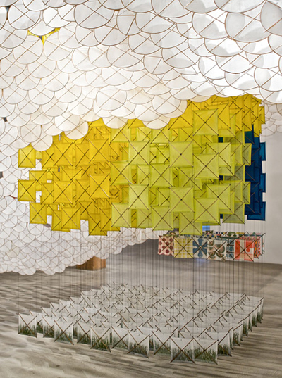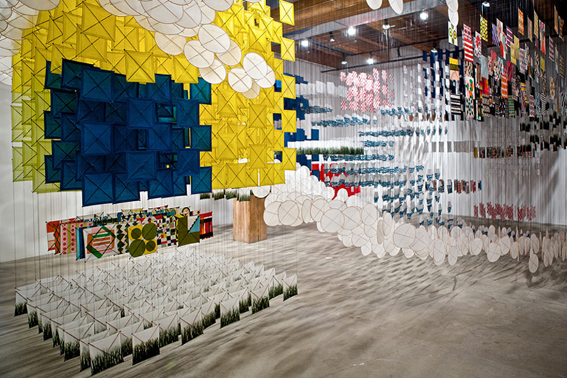 jacob hashimoto is known for altering large gallery spaces with his colorful installations of hanging kite-like paper structures.