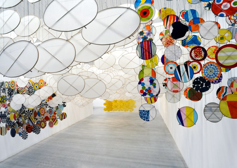 ronchini gallery in collaboration with studio la città present the first solo show in the UK of new york-based artist jacob hashimoto. the site-specific installation entitled ‘the other sun’ is composed of hundreds of small paper kite elements which are a signature of the american born artist. these delicate components are made using traditional kite-making techniques whereby paper is adhered to bamboo frames of varying sizes. the resulting individual parts are strung together and suspended from parallel dowels, arranged into a larger layered, sculptural landscape which looms above the viewer. the cloud-like forms, employ both solid colored and patterned ‘kites’ which provide a pictorial quality to the dense overall network at hand. working across the intersection of painting and sculpture,abstraction and landscape, the pieces hashimoto creates generate a dialogue between spatial considerations of sculpture and that of the illustrative devices of painting.