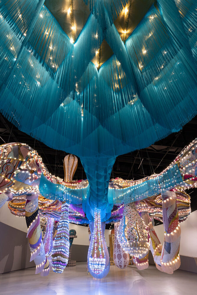 The Plug-in exhibition takes place in both museum buildings, now known as MAAT Central and MAAT Gallery. In the former, Joana Vasconcelos (see more here) presents Árvore da Vida / Tree of Life (2023), created in the context of the Portugal-France Cross Season and now adapted to the Tejo Power gallery. At the gallery, a total of six works are on display: the brand new Drag Race (2023), which links back to War Games (2011), two conventional vehicles transformed into works of art — the first exuberantly ornamented with gilded carvings and feathers and the second covered with toy rifles and filled with stuffed toys. Two other pieces featured at the Guggenheim Museum Bilbao also landed for the first time in Lisbon: the mirror mask popularized with the title I’ll Be Your Mirror (2019) and the gigantic Solitaire ring (2018) installed outside the museum. From Asia comes the tentacular textile sculpture Valkyrie Octopus (2015), created for the casino MGM Macau and hung today in the MAAT’s Oval Gallery.