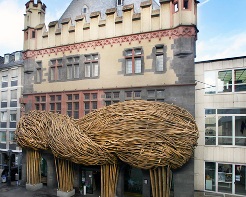 to coincide with the exhibition ‘roots. indonesian contemporary art’ at the frankfurter kunstverein, indonesian artist joko avianto has wrapped the museum façade in a monumental bamboo weaving. using sturdy lengths of the natural material, avianto has formed a site-specific, large-scale work that both interacts with and juxtaposes the existing architectural fabric. a towering, basket-like interlace of rough, dry shoots undulates overhead visitors entering the museum, welcoming them into the exhibition about indonesian art with a medium that expresses the nature of the culture.