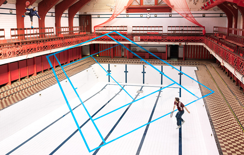 inside a derelict swimming pool in glasgow, photographer joseph ford worked with seven assistants, two anamorphosis artists, two parkour athletes and 2.5 kilometers of blue tape to make one mind-bending match of tennis. for an editorial in avaunt magazine, ford and the team mapped out the boundaries of a court with gaffer tape, carefully positioning the lines within the empty pool to intentionally distort the perception of space. the anamorphic quality of the composition means that the viewer must occupy a specific vantage point to reveal the image correctly — in this case, as seen from the building’s second level balcony.