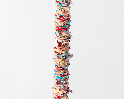 british conceptual artist lenka clayton has arranged ‘confetti stack’ from 18,180 individual paper sheets. configured in a straight vertical line, the free-standing sculptural form towers overhead as if performing a careful balancing act. the colorful circles are miniature — with a diameter of only 1.5cm — and have been intricately amassed one on top the other, forming a kaleidoscope of collected confetti material. spanning 190cm (over 6 feet) into the air, the vibrant paper pole seemingly defies gravity, imposing over visitors to the CEAAC in strasbourg, france where it is currently being exhibited as part of the ‘seymour’ show.