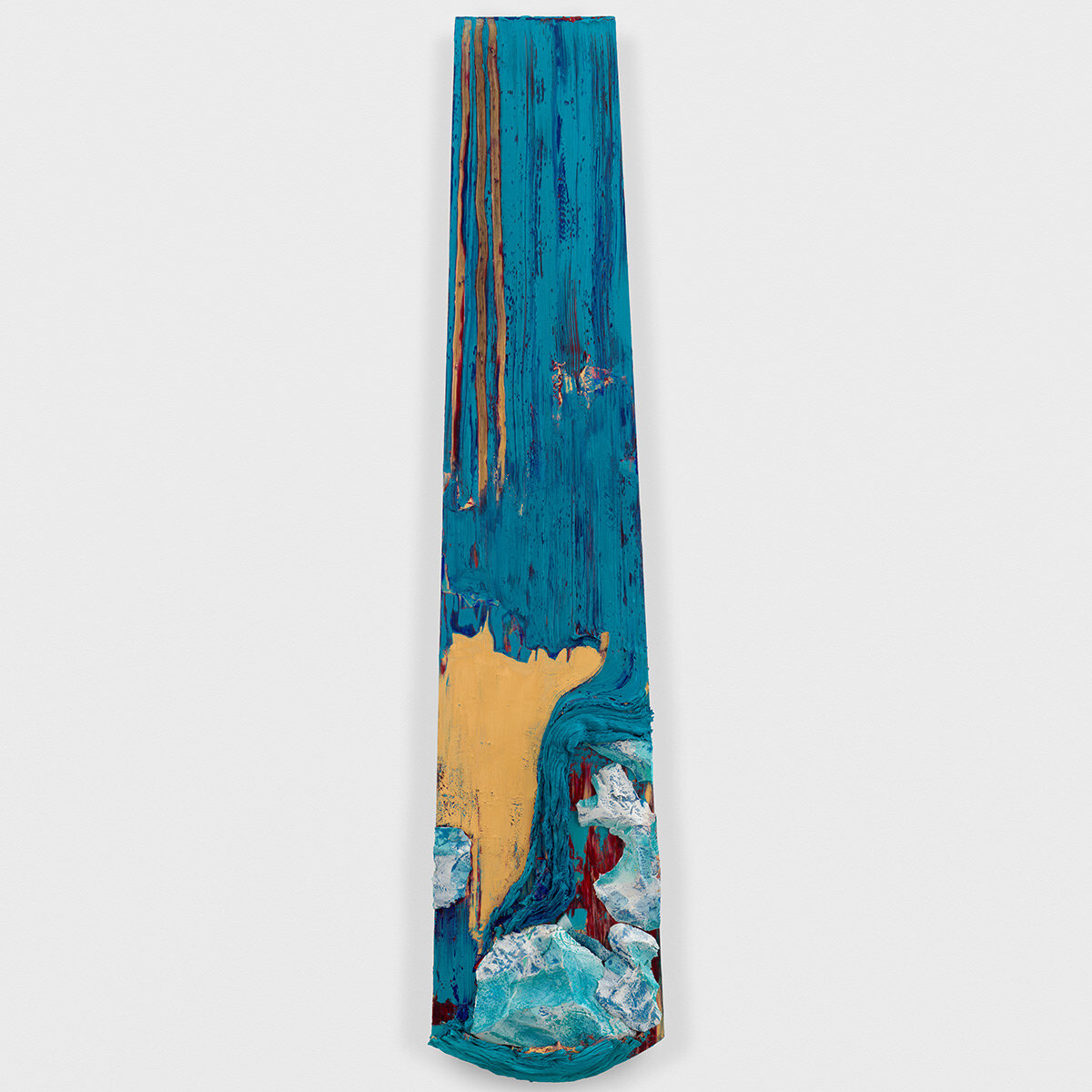 LW: I work in oil paint, as it stays soft and malleable long enough for me to manipulate it before it sets. There are several techniques, depending on what I’m looking to achieve. In some cases, I will build up many thin layers of color to create a kind of thick skin that I can then push and fold over to reveal the colors beneath. In others where I want the forces of gravity to be dominant, I will make the paint so viscous that it wants to slide down from its own weight. And at other times, I’m building up dimension by collaging bits and pieces of dried paint that resemble old driftwood.