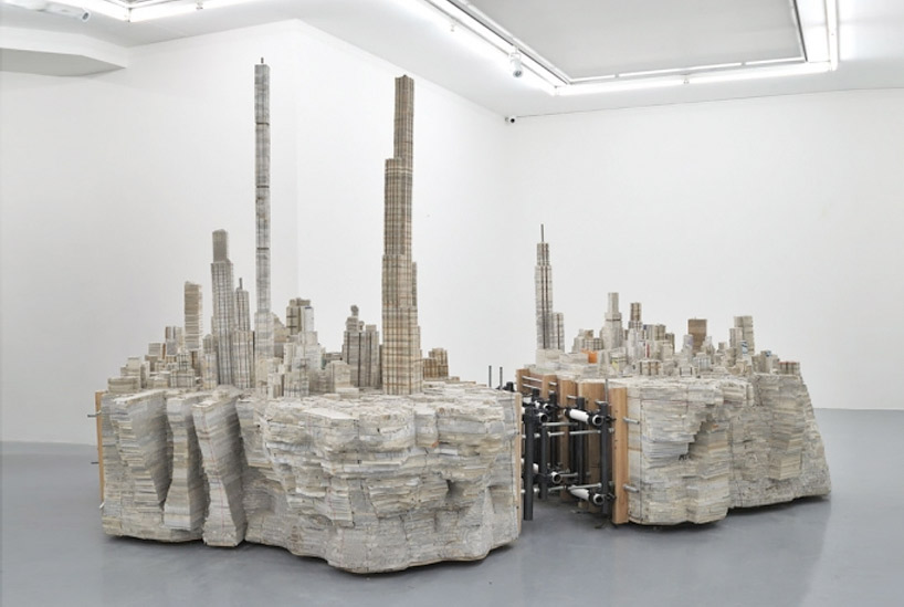 artist liu wei has developed a body of sculptural and painted pieces on display in his first solo exhibition in paris at almine rech gallery. the beijing-based creative brings together an assemblage of works depicting dually utopian and dystopian metropolises built from new and repurposed materials such as books, doors, scrap metal and hardware. liu wei has created replicas of iconic structures such as st peter’s basilica and the pentagon in addition to cityscapes familiar to the general public.