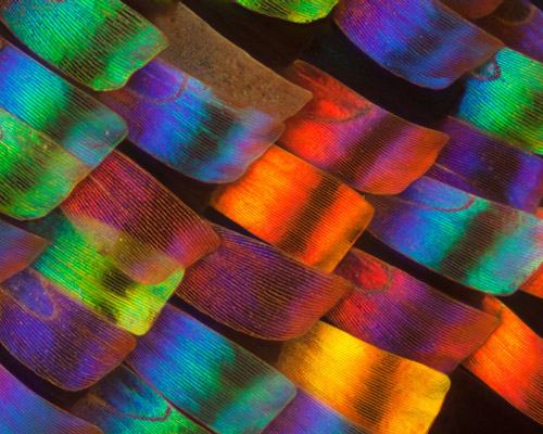 biochemist and photographer linden gledhill has captured a mesmerizing series of images which study the structure of butterfly and moth wings. using various levels of magnification, the macro shots zoom in on what is an incredible and kaleidoscopic visual: the intricacy and delicacy of insects’ wings. specimens of varying species and physical characteristics are collected, documented and later photographed using an automated macro focusing rail. forming an iridescent quilt, the scales layer in depth, volume and chroma, shimmering and glittering in a multidimensional composition. at the range of enlargement gledhill shoots the images at, they are near impossible to recognize as the physical characteristics of the flying species, but instead transform into dazzling perspectives on a part of the natural world.