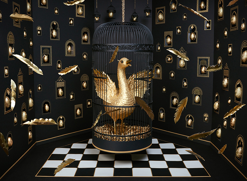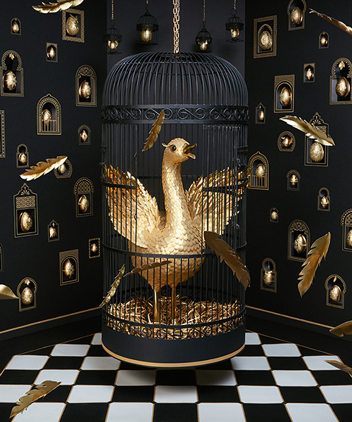 enchanted by the ornamentation of moroccan architecture, and the imaginative imagery of fairy tales, makerie studio has handcrafted ‘the golden goose’ using rare and fine paper sheets. the new york and london based studio — comprised of julie wilkinson and joyanne horscroft — have created this bespoke, large-scale sculpture within a black-painted room. at the center of the space, an intricately crafted bird formed entirely from golden paper feathers is caged in metal enclosure, left slightly ajar. gilded straw sits in a plush pile at her feet, while a few sparkling feathers free float around the frame. sitting within small carved apertures in the walls is a collection of individually-crafted eggs, each completely unique with a distinctive design decorating its surface.