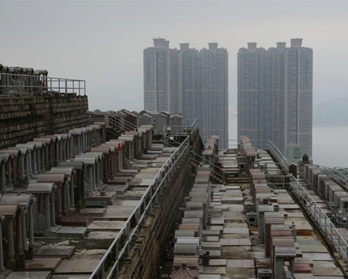 resembling ancient amphitheaters, this series of photographs by manuel alvarez diestro exposes the tightly packed cemeteries around hong-kong. the eerie images juxtapose the two parallel worlds of the living and the dead, and the environments in which they must co-exist. overlooking the city from different angles, the vertical structures in the background help to increase the sense of density within the two contrasting worlds. the photographs also display similarities of repetition within the built forms, helping to merge them in with the surrounding urban fabric. ‘hong-kong amphitheater’ confronts the idea of cemeteries as important public spaces and remembrance.