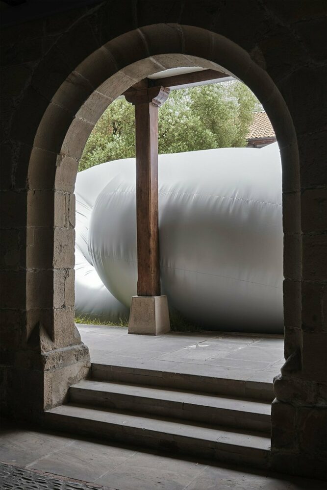 the soft body disrupts the repetitive arches and the carved stones’ rigid tectonic
