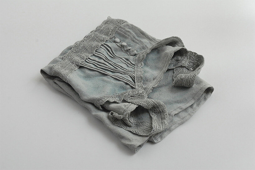 ‘by using the plasticity of clay, I try to reproduce the softness of clothes,’ the artist continued. ‘through the firing process, the clay is hardened and keeps the image of the object. it becomes a memory medium. I have the feeling that the presence of the previous owner and my time are mixed together. concerning the objects made in ceramic, I feel them like poetic memories of our absolute loneliness and the joys and sorrows of our daily life.’