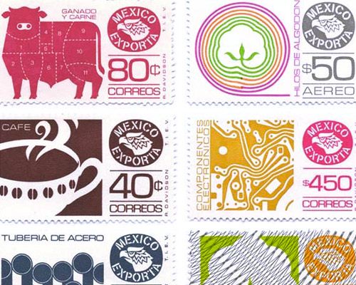 the collection of ‘méxico exporta’ stamps that were designed by rafael davidson between 1975 and 1993 to promote mexican exports are currently on show at the philatelic museum oaxaca, mexico (MUFI) . the exhibition, which was curated by jimena acosta, renata fenton and emiliano godoy will run from 15 november 2013 – 20 january.