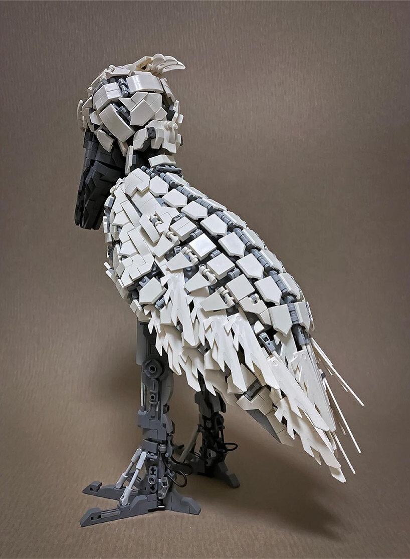 japanese LEGO enthusiast mitsuru nikaido reimagines animals of land and sea as mechanical characters made out of the famous danish building blocks. the intricate works present a wide range of species, including a walrus, snail, shoebill, cicada, and even a triceratops. the sculptures are almost exclusively composed of gray and white blocks, forming semi-articulate, robot-like creatures.
