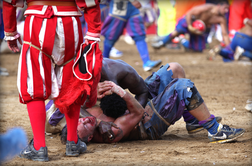 every year in june and july, amidst the traditional ceremonies, parades and authentic colorful costumes, calcio storico fiorentino – the sporting event originally traced back over 500 years ago in florence – is held. four teams rule the show – bianchi, verdi, rossi and azzurri – each with 27 combatants, battling to reign champion. re-visiting a time where competitive sports drew blood and broken bones, the spectacle fuses a mix, of rugby, football, boxing, mixed martial arts and greco roman wrestling into an ‘everything goes’ type match.
