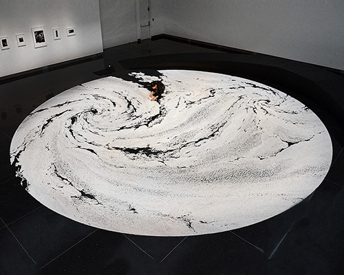 japanese artist motoi yamamoto has completed two monumental salt works in utah, encompassing the ground floors at westminster college and weber state univiversity. using his trademark medium, yamamoto has created new iterations of his ‘floating garden’ lacework, this time bound within the confines of a circular form. filling the shape are minutely interconnected lines of matter, linked to each other within the complex labyrinth. the swirling, hurricane-like pattern is used as a symbol in east asia, representing life and death, resurrection and rebirth and the displays of vitality. ‘there is no set motif in the patterns I draw‘ yamamoto explains, ‘but shapes and forms that can be found in nature such as typhoons, whirling tides, and galaxies are part of my work.’ creating such intricate netting on such a mammoth scale requires patience and practice. holding a bottle of salt in hand, the artist must sit down in a small space where no particles will be laid, simultaneously moving the container with a certain rhythm. the subtle movement creates tiny cells that mimic bubble-like patterns, each of which symbolize pieces of memories and fragments of time.