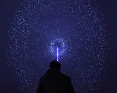 the installation simulates the movement of sound waves, building a luminous bridge between the physical and the virtual worlds