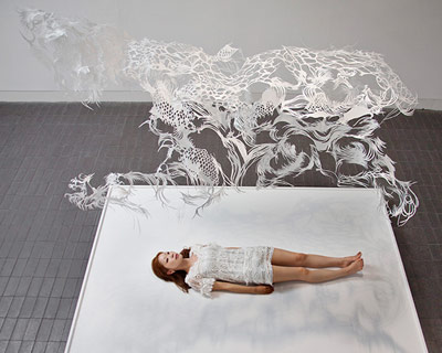 nahoko kojima walking beneath the delicately hand cut ‘byaku’ in london