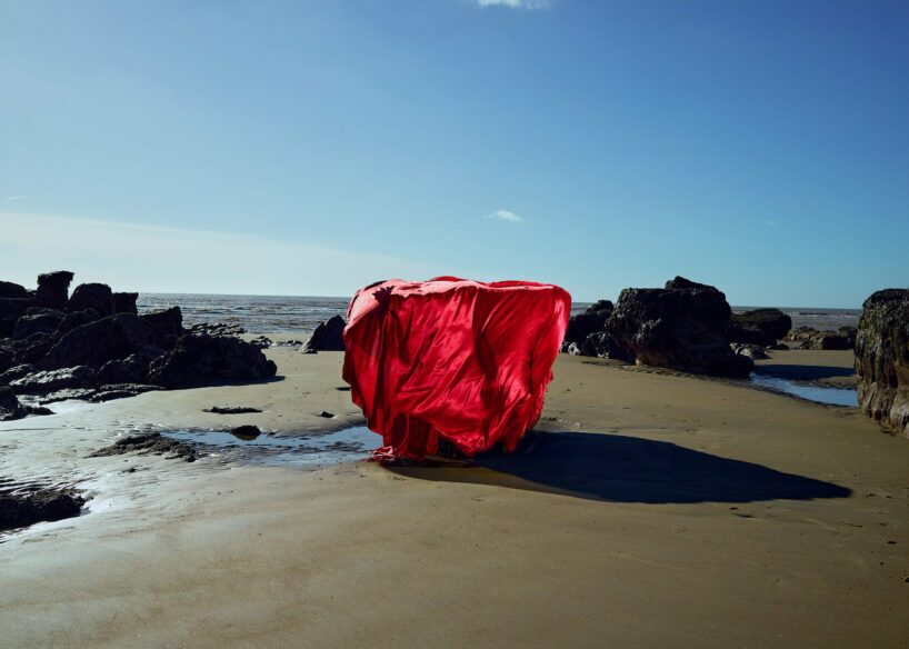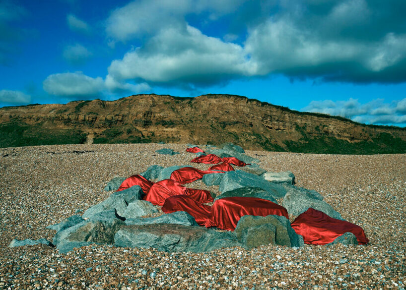 Neal Grundy’s Safe from Harm photography series explores rock erosion of coastal landscapes, focusing on the south of England, where chalk cliffs are rapidly eroding. England’s coastline is among the fastest eroding in Europe, with some areas losing up to two meters annually. Grundy uses brightly colored fabric to draw attention to the consequences of erosion. The vivid materials highlight concrete sea defenses, fallen rocks, and other man-made interventions, emphasizing the fragility of these landscapes.
