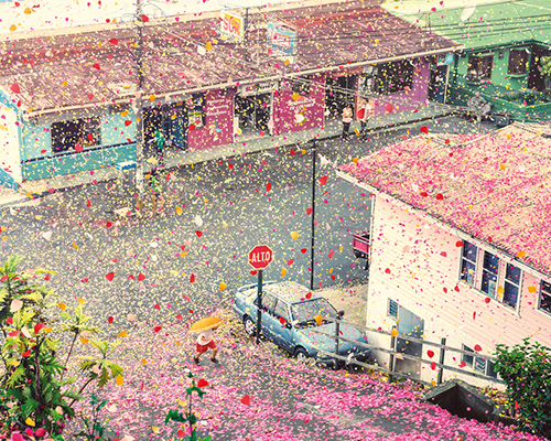 worldwide advertising agency mccann has commissioned photographer nick meek to visualize the images for the campaign of sony‘s new 4k TV, a monitor which promises four times the detail of full high definition. the team flew to the colorful tropics of costa rica, where they collected thousands of lush, vibrant botanical life — like multicolored flower petals and leaves — for more than two weeks. these materials would become the fundamental medium for the project: to illustrate the excellence in focus, the petals were blown and exploded throughout the island landscape, whirled through the prismatic suburban streets, blasted out from a neighboring volcano, and blanketed on a pathway where a young skateboarder drifts past. the detailed vistas, which describe the extreme caliber of sony’s new device, are so sharp and clear that the viewer is immediately enveloped in the hyper-realism.