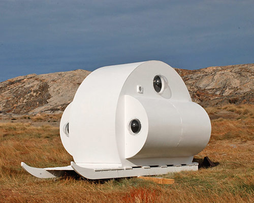 occupying a small space in the vast expanse of the icy uummannaq island high above the arctic circle in greenland are dutch artist rob sweere‘s set of sled habitats. the two sculptural dwellings that make up his ‘sledge-project’ are pictured parked in the chilly landscape, yet they are movable units, able to be towed by draft animal over the sea-ice. each snowmobile accomadates 6 people, is insulated, and can be used for sitting, cooking and sleeping. irregular in shape and construction, the bespoke design details hidden within the hut, like transparent portholes for outside panoramas, benches, and tabletops, allow for both functionally and aesthetic beauty.