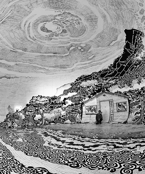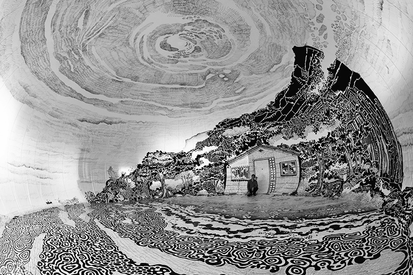 inside a former soy sauce warehouse on the japanese island of shodoshima, artist oscar oiwa has installed ‘oiwa island 2’ as part of the 2016 setouchi triennale. the large-scale work has been realized inside the spherical chamber of a 6-meter diameter inflatable vinyl dome. the brazilian-born japanese artist has intricately illustrated the interior walls of an all-white bubble, surrounding visitors in a labyrinth of monochromatic graphics and motifs drawn in black permanent marker.
