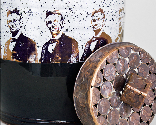 a mutual love for abraham lincoln spurred the creative collaboration between american artist stacey lee webber and ceramicist justin rothshank on a series of eight handcrafted vessels. wheel thrown jars with shining, patterned images of lincoln’s face in copper luster have been crafted by rothshank, made of earthenware clay and varnished with layers of glossy white and black glaze. the rounded volumes were then shipped to webber, who thematically ties in the president’s appearance on US currency in the creation of each container’s lid. pennies are hand-cut, soldered, fabricated, and patinated to form a complex, layered pattern, leaving no two lids alike. doughnut-shaped coin manipulations and molten sheets of interwoven copper pieces clad each covering, all completely bespoke in texture, size and pattern. the pieces will be shown in the 2014 american craft council show in baltimore, MD and the 2014 smithsonian craft show.