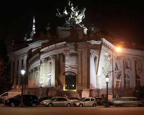french artist pierre delavie has transformed the grand palais in paris into an ‘urban lie’, distorting the architecture of the famed building with ‘neo – rapt architectural’. questioning reality and manipulating city landscapes, delavie changes the face of building facades, integrating fake structural elements and projected light into the existing space. by manipulating the exterior skin of the renowned european museum, he forms a new archetype he calls, ‘architectural abduction‘, where the falsification of the traditional image is changed and reinterpreted as a new space. additions and subtractions render the structure imperfect, changing the manner in which passers-by perceive the historically significant landmark.