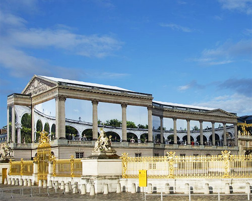 as the palace of versailles undergoes a monumental interior and external renovation, an enormous canvas designed by french artist pierre delavie masks the restoration of the roofs of the pavillon dufour and the vieille aile, until its completion in march 2015. the artistic undertaking sees the historic site team up with french luxury fashion house dior once again, furthering their collaboration and creative exchange which dates back to 1947.