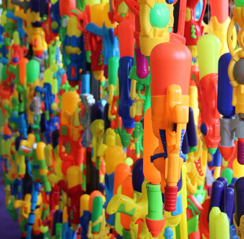 a collection of colorful squirt guns seem to rain down from a curving metal support beam