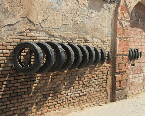 the works are made with cut salvaged tires, which were then hung in various situations and environments around the urban landscape of barcelona’s ‘tomato district’ — also known as the ‘manchester’ of catalonia. by going beyond the formal limits of the walls, onlookers are initiated into a playful dialogue between physical and imagined worlds.