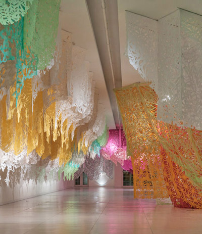 white fabric secured to the ceiling brings a cloud-like atmosphere to the gallery