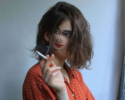 berlin-based artist sebastian bieniek unfolds the story of a two-faced female in his series of photographs ‘doublefaced’. using an eye pencil and lipstick, bieniek simply draws an image of a face onto the side of skin. the sketch includes only one eye: carefully placed hair hides the rest of the face from view, revealing one, moving eye of the model. blue, brown, awake, and sleeping variations create portraits with unique expressions and an illustrative sensibility. the 22 photographs of the hybrid girl expose her daily routine — drinking coffee, traveling on the train, taking a shower, and smoking cigarettes — capturing the daily life of a female with two faces.