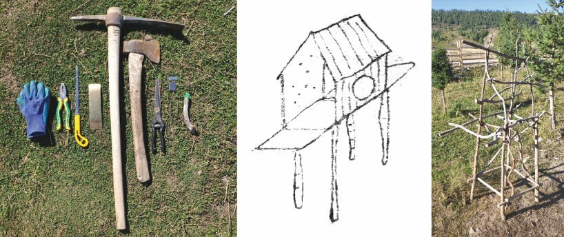 the structure is composed of wood from the meadows, and brass plates from a local horse harness shop