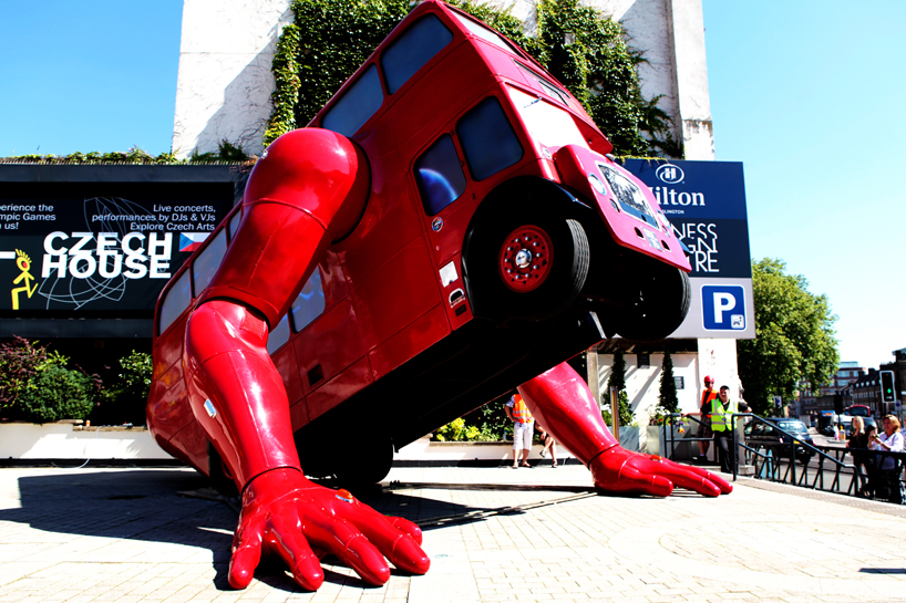 ‘london booster’ is an installation commissioned for the london 2012 olympics created by czech sculptor david černý. situated outside of the czech house in the british capital, the mammoth sculpture is composed of a 1957 ‘routemaster’ double-decker bus outfitted with bulging working mechanical arms and a sculpted buttocks, which when switched on, finishes push-ups in reps of ten.