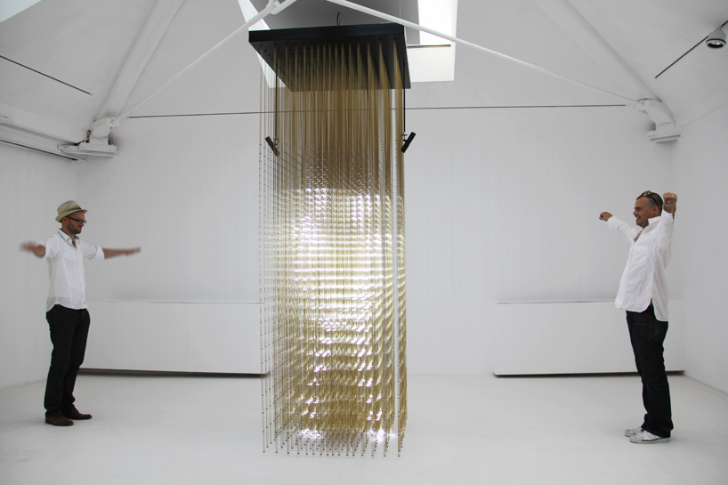 random international: before the rain three cubes composed of polished brass rods translate viewers movement into moving light image © designboom