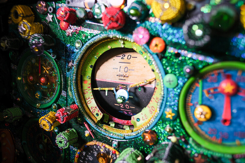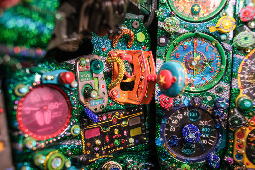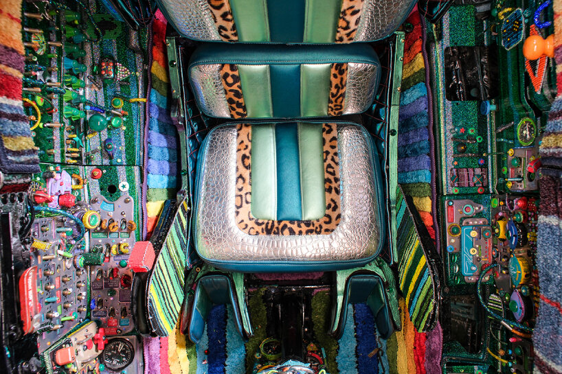 detail of the cockpit and flight stick replaced with a lowrider style steering wheel | photo by Paul Duran-Lemos