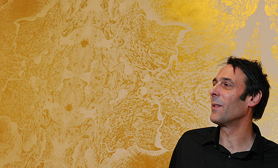 for his main piece in the show at tate britain he has created a whole wall with a symmetrical abstract design that looks like a giant rorschach test.