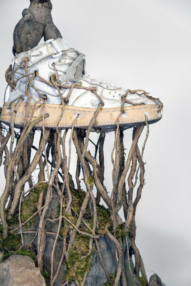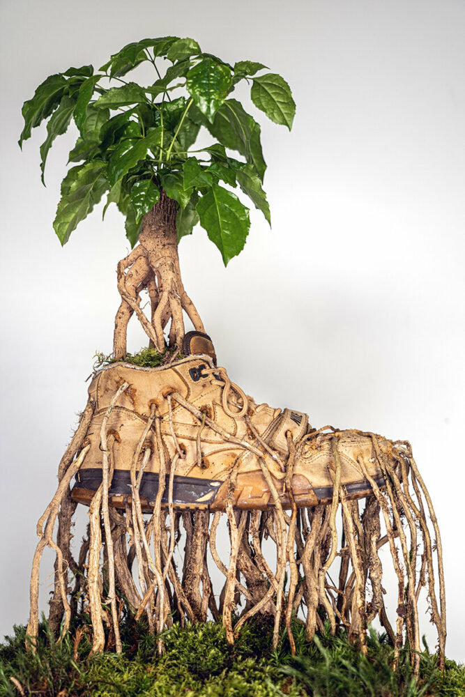 each sculpture of Bonzaï Sneakers contorts a plant into a NIKE shoe
