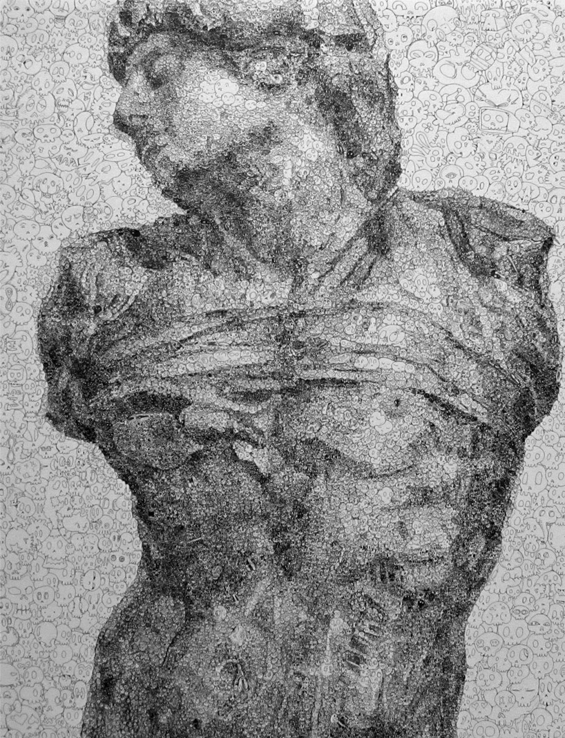 slave detail whereby hundreds of comic-like skulls are drawn to form the figures