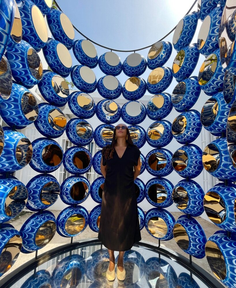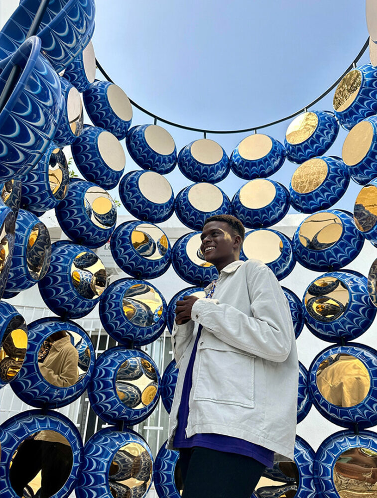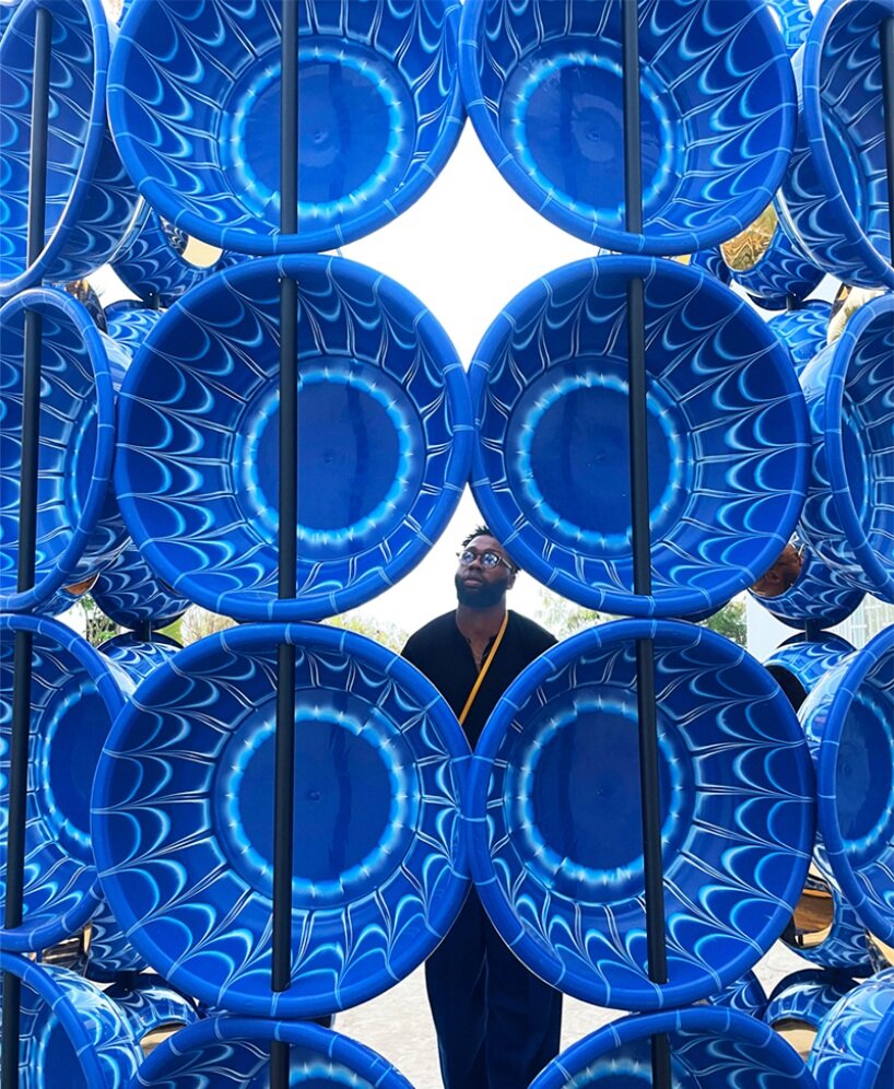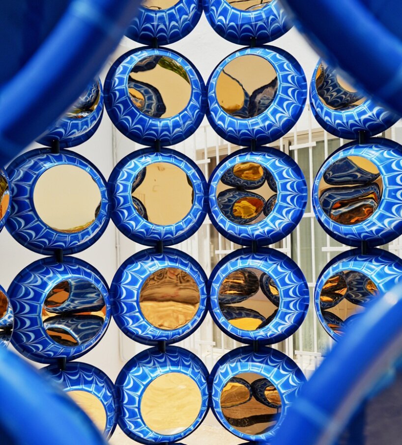 84 recycled plastic basins affixed with repurposed plexiglass are configured in a tubular form, with 12 upcycled steel frames sitting on a 2 meter steel base. A vibrant reflective blue, the work creates a striking juxtaposition from its contextual surroundings with its composition of color, order, and scale, emphasizing the importance of the use of local, recycled materials in the built environment.