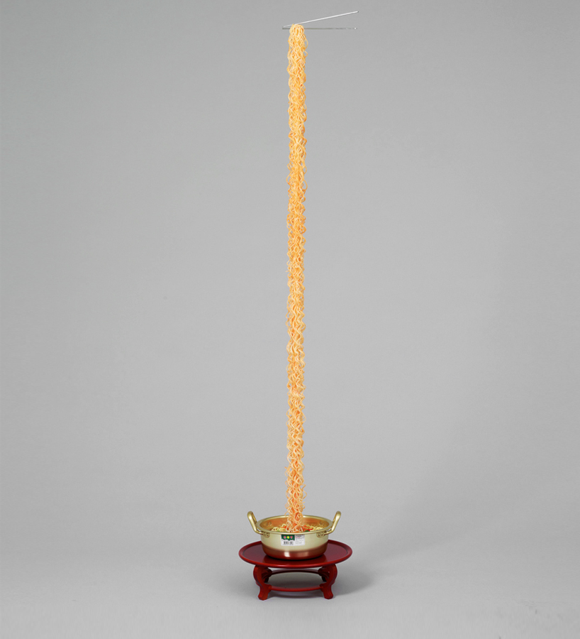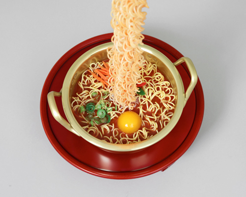 adapting both cultural and culinary influences, auckland-based artist seung yul oh sculpts a series of traditional korean dishes from silicone and resin. lengths of varying strands and types of noodles — hanging 12 feet from the surface of the floor — stretch from space, dangling down into pots and bowls filled with modeled vegetables and broth. hyper-realistically crafted egg yolks, carrots, seafood, and meats seemingly extrude from the faux-liquid, materializing as actual ingredients drifting in the dish. a pair of chopsticks float at the sculpture’s crown, creating a surrealistic illusion that the elongated fine fibers are weightlessly hanging in mid-air.