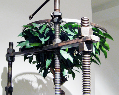 wire cable, clamps, metal plates are used to ‘torture’ each bonsai tree into strange positions image © designboom