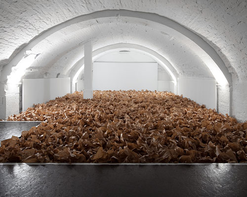 amalgamating sound, space and simple mechanical parts, bern-based studio zimoun constructs immersive installations that breathe life into humble objects and items. their latest auditory sculpture, ’43 prepared dc-motors, 31.5kg packing paper‘ mobilizes a massive plane of crumpled brown sheets, installed on the ground at the orbital garden bern, switzerland. the motors situated beneath the crimped paper arrangements subtly animate the sweeping surface, shifting different segments at various intervals so that the entire expanse seems to be slowly inhaling and exhaling. steadily in motion, the field stirs with a rustling sound that is very much a part of the sculpture’s intention — patterns of noise and sequences of echoing audio materialize in the kinetic sphere.