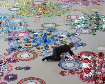 when viewed from a distance or from above, the work looks organized and neat, but with close contact, visitors enjoy seeing the many intricate details resulting from the skilled craftsmanship that goes into each art piece. in much of her work, drummen places each glossy element loosely on the floor, making the artwork vulnerable and ephemeral.