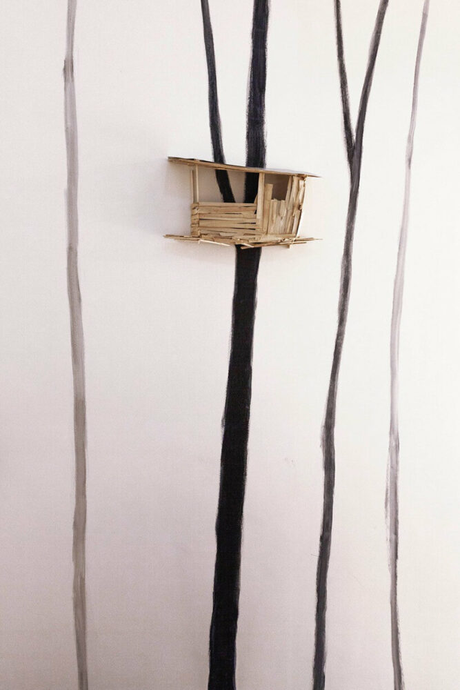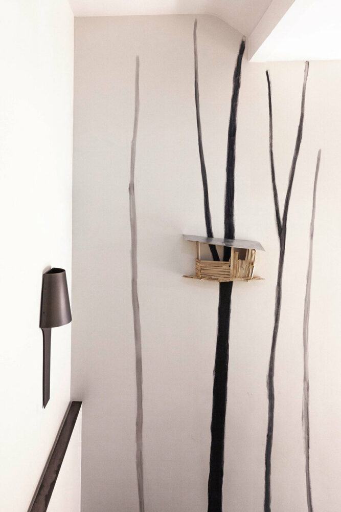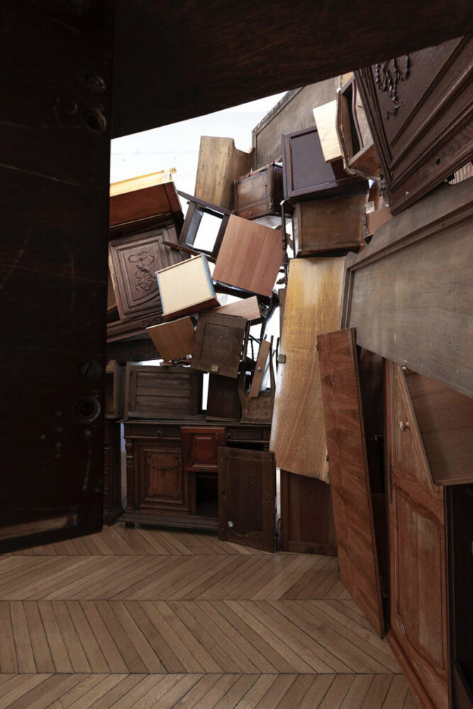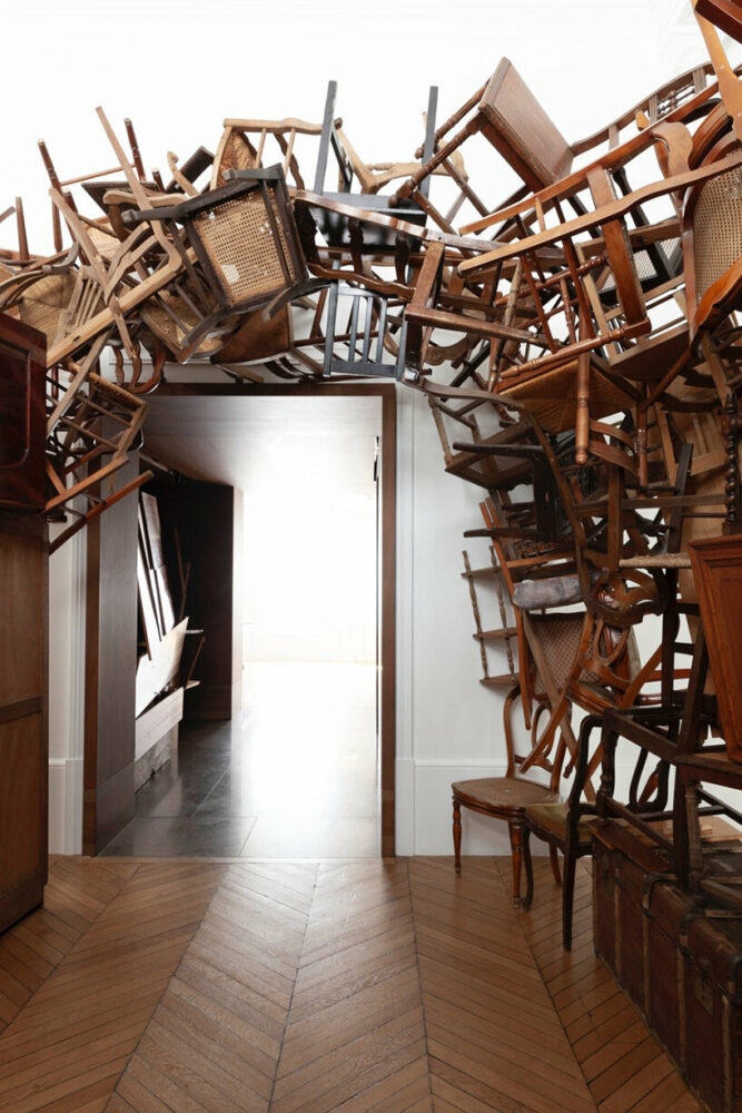 Set specifically on the third floor under the glass roof of the Liaigre workshop, the spiral tower of chairs stacked one on top of the other by Tadashi Kawamata (see more here) occupies the building’s narrow balustrade space, allowing zenithal light to filter through and catch the materials. The visitor is then invited to explore the different floors of the Liaigre mansion and discover Kawamata’s artistic universe interacting with the interior architecture. At every corner, piles of wooden chairs, tables, and chests of drawers, exuding a range of wooden hues, invade the floors, walls, and doorways, creating cocoon-like atmospheres that invite visitors to take a moment to pause, exchange ideas, and perceive every space differently. Complementing the central installation are small, abstracted nest figures populating the building’s stairwell. The exhibition, part of Paris+ par Art Basel 2023, is running between October 10, 2023 and March 25, 2024.