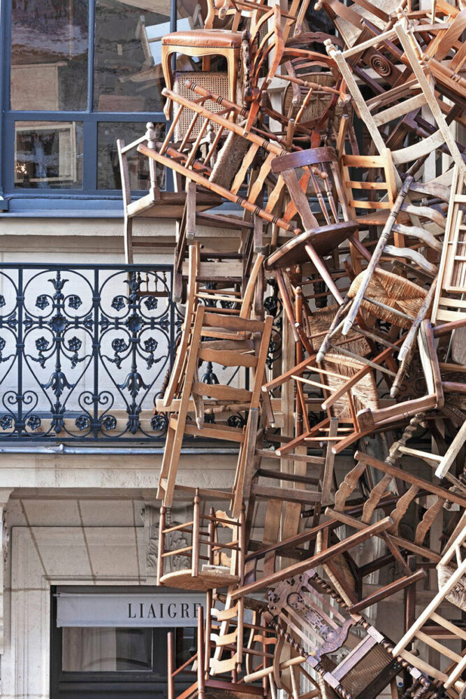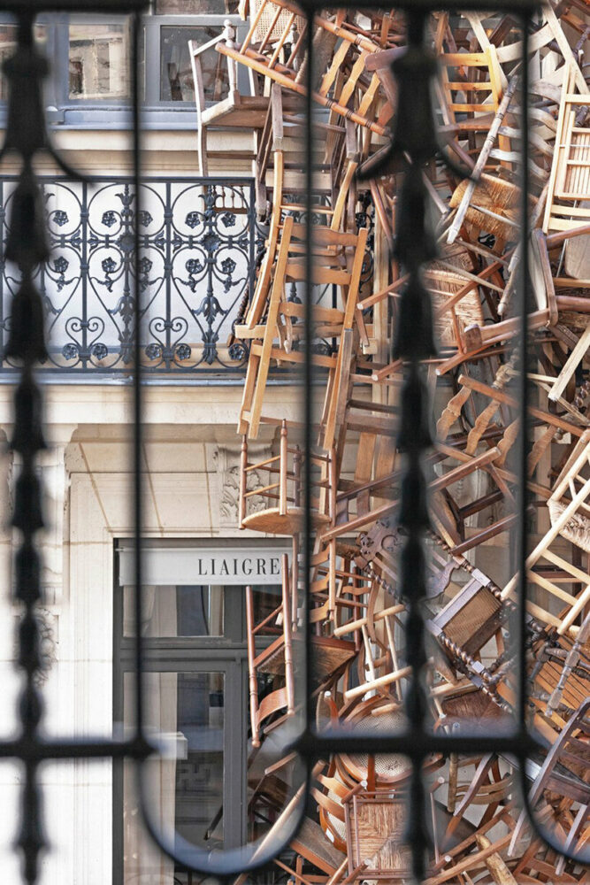 tadashi kawamata nests a tower of wooden chairs onto liaigre's parisian mansion facade