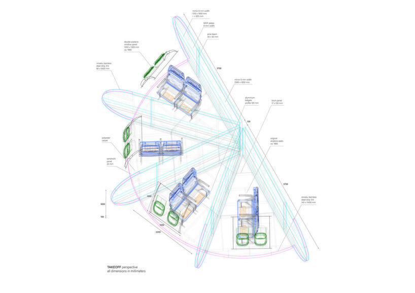TAKEOFF follows weinberg & ben-ami‘s material, visual, and experiential research into aviation and flight experience. since 2018, the pair has embarked on an experimental jet journey, used social media as a platform for broadcasting fictional journeys, and even hand-cut and built a section of an airplane model in 1:1 scale.