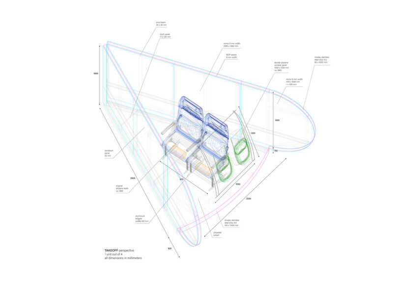 with this work, weinberg & ben-ami seek to recreate the tension commonly present in the temporary community of passengers in-flight. on the one hand, the experience allows for a collective interaction of a wide variety of people at once in the space. on the other hand, they aimed to recreate a very personal and intimate experience in each separate unit. in that manner, they establish a discord very similar to what occurs nowadays in passenger flights. TAKEOFF was on view in hansen house as part of this year’s design week in jerusalem from july 1-8, 2021.