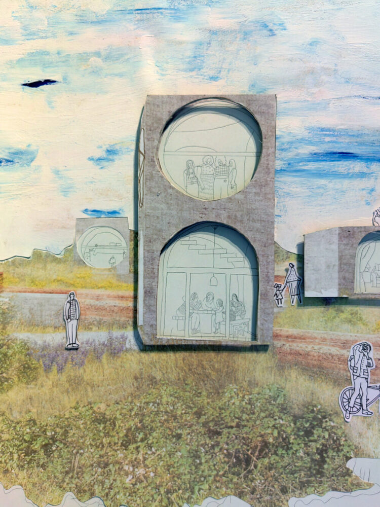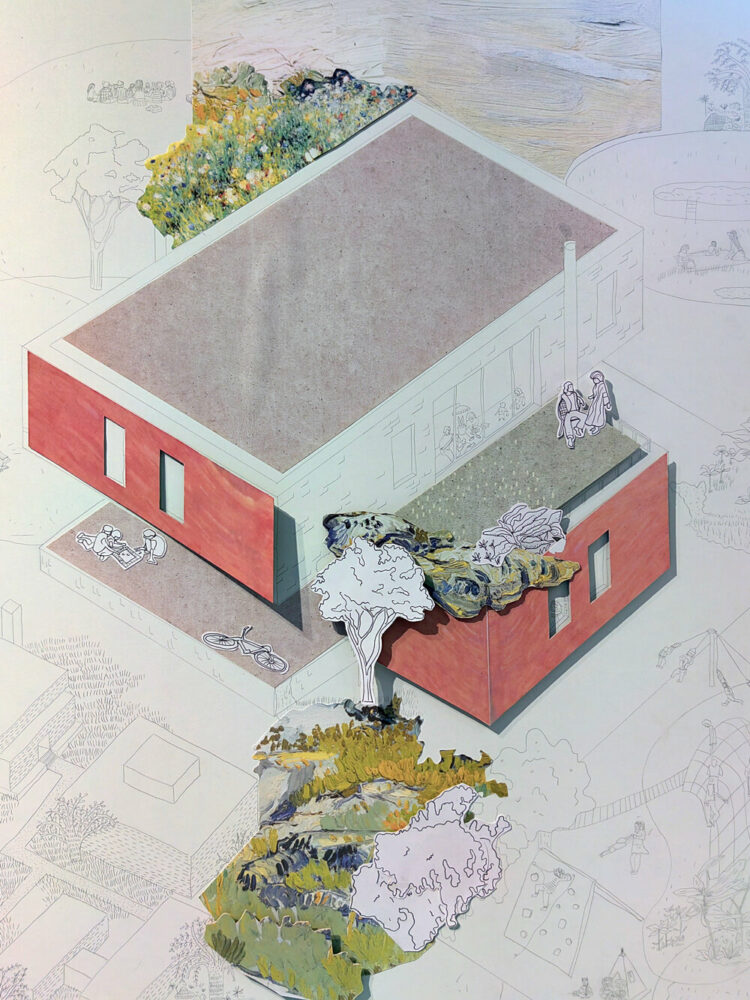 Through this exhibition, Tatiana Bilbao Estudio (see more here) shows eight exemplary projects as a reference for their practice, including the design mediums and materials they employ. The exhibition hall is covered with large-scale models made of concrete, rammed earth, wood, or brick, and generous meticulous-hand-designed drawings interwoven with vivid collages. Each collage portrays a vibrant story that aims to create a dialogue with the audience. Free from realistic representations, ‘En común’ disobeys the rigid boundaries of renderings and seeks to uncover different ways of communicating and thus living.